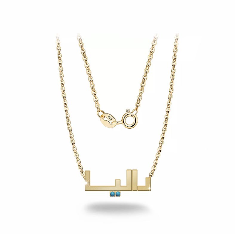 أضيفي هذا العقد إلى مجموعة مجوهراتك عقد مع تعليقة بالاسم بالخط الكوفي المربع مصنوع من الفضة الاسترلينية عيار 925 مطلي بالذهب مع الحجر الفيروزي معبأة بعناية في صندوق مجوهرات جميل، ويمكن أيضاً تقديمه كهدية رائعة للتعبير عن حبك لمن تحب هدايا رائعة في عيد الأم أو عيد الميلاد أو الزفاف أو الخطوبة أو التخرج أو عيد الحب أو حتى لنفسك أو في أي مناسبة، طول السلسال 45سم المنتج من الفضة 100% مطلي بالذهب عيار 21 قيراط، إذا لم يكن اسمك موجود على الموقع يمكنك إجراء طلب شراء لنفس المنتج لأي اسم وكتابة الاسم المطلوب في خانة الملاحظات.