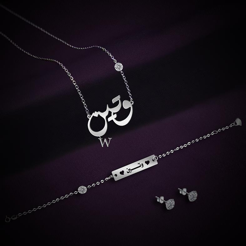 طقوم فضة نسائية، مجموعة مجوهرات نسائية، طقم فضة عقد وإسواره بالاسم وحلق مع الزركون مصنوعة من الفضة عيار 925 اسم وتين