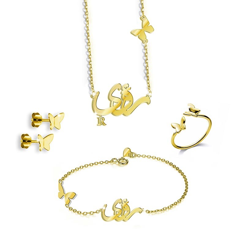 مجموعة مجوهرات نسائية طقم فضة بالاسم عقد وإسواره وحلق وخاتم مصنوع من الفضة عيار 925 مطلي بالذهب عيار 21 قيراط اسم رؤى