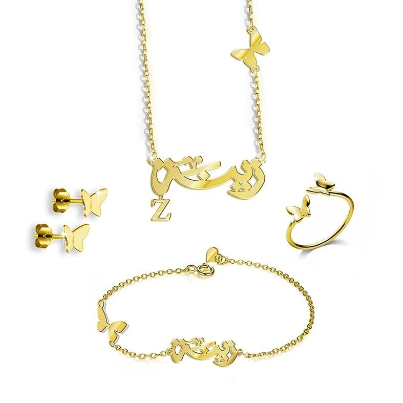 طقم مجوهرات نسائي بالاسم مصنوع من الفضة 100% عيار 925 مطلي بالذهب، هدية مثالية معبأة بعناية بعلبة وتغليف فاخر، للاستخدام الشخصي أو تقديمها كهدايا رائعة في عيد الأم أو عيد الميلاد أو الزفاف أو الخطوبة أو التخرج أو عيد الحب أو في أي مناسبة، طول السلسال 45 سم حجم الاسم 3.3 سم طول الاسوارة من 17 إلى 20 سم، عقد واسوارة وحلق وخاتم، إذا لم يكن اسمك موجود على الموقع يمكنك إجراء طلب شراء لنفس المنتج لأي اسم وكتابة الاسم المطلوب في خانة الملاحظات.
