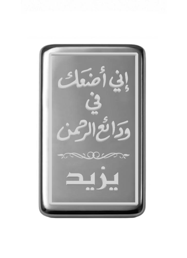 سبيكة فضة صافي 100% نصف أونصة وزن 15.55 جرام المصنوعة من الفضة الصافي بأعلى درجات النقاء 24 قيراط ونسبتها 999 بوزن 15.55 جرام محفور عليها عبارة -اني أضعك في ودائع الرحمن- مع حفر الاسم باسخدام تقنية الليزر مما يجعلها خياراً مثالياً لتقديمها هدية لمن تحب. قطعة ذات جودة عالية حجمها 4 × 2.5 سم يسهل حفظها وتخزينها، مناسبة للإهداء والاقتناء، سوف تحصل على المنتج مع علبة وتغليف فاخر مناسب للإهداء.
