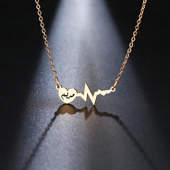 عقود للنساء، مجوهرات نسائية، عقد ذهبي نسائي سلسال مع قلادة شكل موجة نبض قلب محفور عليها الاسم مصنوعة من أجود أنواع الفضة الاسترلينية 100% عيار 925 مطلية بالذهب عيار 21 قيراط طول السلسال كامل 45 سم حجم الاسم 3.8 سم مجوهرات أصلية مناسبة جداً للاستخدام الشخصي أو لتقديمها كهدية في الأعياد والحفلات وجميع المناسبات. تأتي القلادة بصندوق محفور عليه اسمك وتغليف فاخر . جميع الأسماء متوفرة وفي حال عدم وجود اسمك يمكنك إجراء طلب شراء لأي اسم وكتابة الاسم المطلوب في خانة الملاحظات.