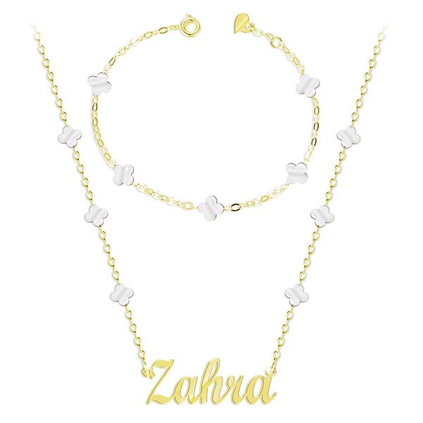 مجوهرات نسائية طقم فضة مكون من عقد واسوارة مصنوعة من الفضة عيار 925 مطلية بالذهب مرصع بأحجار زهرة البرسيم اسم زهرة