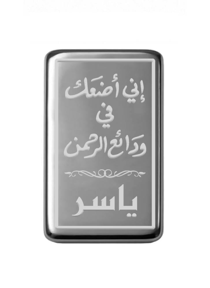 سبيكة فضة صافي 100% نصف أونصة وزن 15.55 جرام المصنوعة من الفضة الصافي بأعلى درجات النقاء 24 قيراط ونسبتها 999 بوزن 15.55 جرام محفور عليها عبارة -اني أضعك في ودائع الرحمن- مع حفر الاسم باسخدام تقنية الليزر مما يجعلها خياراً مثالياً لتقديمها هدية لمن تحب. قطعة ذات جودة عالية حجمها 4 × 2.5 سم يسهل حفظها وتخزينها، مناسبة للإهداء والاقتناء، سوف تحصل على المنتج مع علبة وتغليف فاخر مناسب للإهداء.